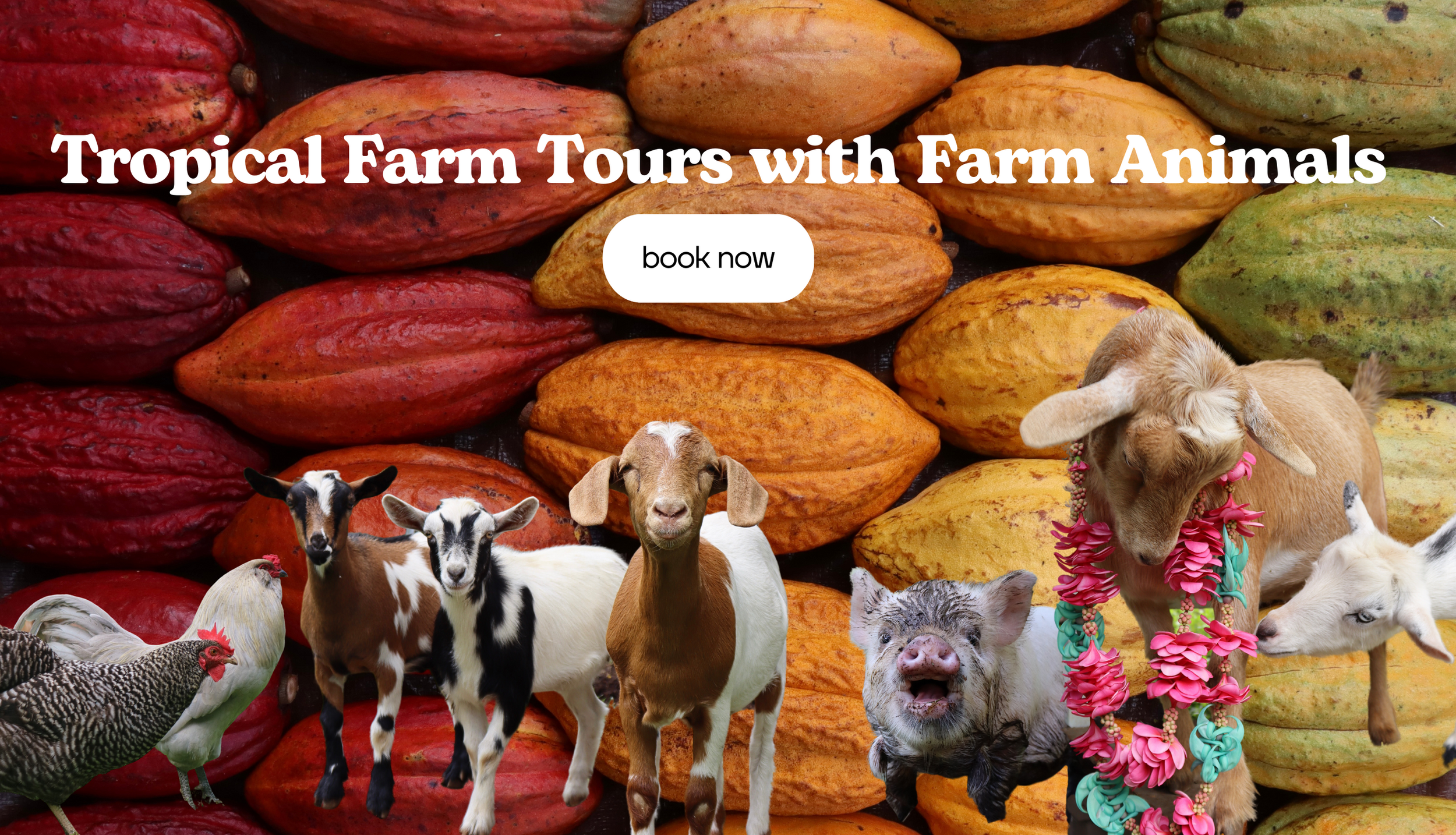 A mature orchard of both Aztec and Hershey’s Cacao is the center point between all the animal pens which offers shade, grubbing for the free range poultry and a magical location to take in all the sights and sounds. On the back side of our cacao orchard is our duck house, home to our Muscovy duck family. They also provide us with big, beautiful eggs and are a great addition to our farm’s Integrated Pest Management (IPM) by eating slugs, beetles and mosquitos. We are continually adding to our farm family and will always have someone new for you to meet for your visits.
